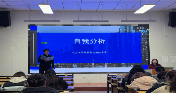 比赛现场气氛热烈,秩序井然。选手们按抽签顺序依次登台,围绕职业目标、自我认知、行动规划等内容展开阐述。他们精神饱满、从容自信,既展现了扎实的专业基础,又彰显出清晰的职业思考和良好的表达才能,赢得了评委与观众的阵阵掌声。 中场计分环节,郭金豪、马怡汀两位同学以歌声舒缓赛程紧张气氛,为现场增添了一抹温暖的亮色。 本次大赛获奖情况如下: 一等奖:马 超 郭韵琪 高静怡 党文娟 二等奖:冯煜美 樊珈成 李浩楠 翟宇佩 马蓉蓉 张晶晶 三等奖:雷文霞 韩佳希 王艺凝 张瑛琪 王亚迪 陈 好 张慧娟 王艺森 赛后,系主任张兴旺进行总结讲话。他充分肯定大赛的意义与成效,指出此次活动不仅有助于学生明确发展方向,也展现出我系学子优秀的综合素质。他强调,学校将持续支持此类活动的开展,希望同学们以赛促学、以规划引领成长,在实践中不断锤炼自我,迈向更加开阔的职业人生。 本次大赛的成功举办,有效激发了我系学生的职业规划意识与专业学习热情。中文系将继续以各类赛事与实践教学为依托,深化人才培养模式改革,助力学子在职业生涯的道路上自信启航、稳健前行。 撰稿:林嘉怡 张梓烨 编辑:高 娜 周艳琳 审核:张海明 张兴旺
